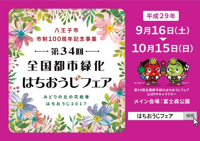 「全国都市緑化はちおうじフェア2017」事業は、「花とみどり溢れる文化的なライフスタイルの体験」をコンセプトに、美しい花と緑が織りなす都市公園環境の中で、花緑の恵みである「食」や「ガーデニング」「アウトドアスポーツ」をはじめとする多様な「学びと遊び」が体験できる「パーク・ライフスタイル」型のフェアを志向するという。メイン会場は、八王子の里地里山の豊かさを体感できる「富士森公園」をメイン会場に、中央地区、滝山地区、夕やけ小やけ地区、南浅川・高尾山口地区、片倉地区、南大沢・由木地区の、八王子を代表する豊かなコミュニティを生かした6つの多様多彩なサテライト会場事業を展開する。
